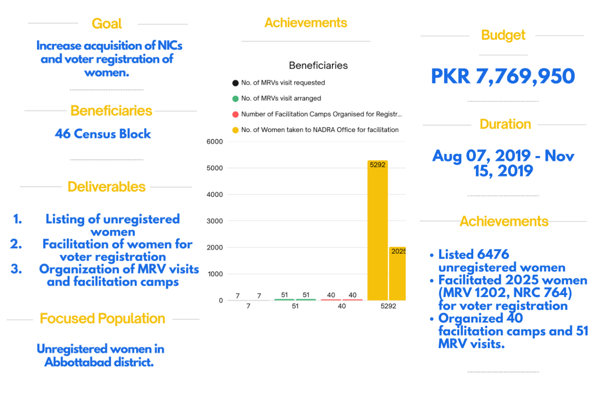 Women's voter registration is particularly low in Pakistan, and has consistently declined in comparison to men's registration. A total of 12.49 million eligible women are still not registered as voters. Considering the gravity of the issues surrounding women's underregistration, the Election Commission of Pakistan (ECP) had made efforts to create a conducive environment for women voters' registration. The ECP has publicly emphasized the need for women voters' registration and explicitly encouraged political parties to take up the issue. More significantly, the ECP had launched an unprecedented “Women National Identity Card (NIC) and Voter Registration Campaign” to minimize the gender-gap on the electoral rolls ahead of 2018 General Elections yielding significant results with registration of 4.3 million women. The ECP's campaign strategy had adopted the methodology proposed by Trust for Democratic Education and Accountability – Free and Fair Election Network (TDEA-FAFEN) for the identification and facilitation of unregistered women. Under this strategy, the ECP had developed synergies with National Database and Registration Authority (NADRA) and civil society organizations comprising mainly of TDEA's partner organizations. According to the ECP there is still a deficit of 12.49 million women as compared to men on the electoral rolls. In Khyber Pakhtunkhwa (KP) as many as 2,094,390 women are missing. This issue of under-registration of women is symptomatic of the social, cultural and religious barriers that restrict women's electoral and political participation. TDEA through CVP's designed Grant Cycle-11 worked in 24 districts across Pakistan facilitating over 150,000 women in acquisition of NICs and as voters ahead of General Election (GE) 2018. Similarly, TDEA through United Nations Development Program's (UNDP) Strengthening Electoral and Legislative Processes (SELP) facilitated over 300,000 unregistered women. These interventions aimed at strengthening citizens' voice through sensitization and education for increasing women voter registration so that they are enabled to exercise their electoral rights. The right to vote and inclusive electoral processes are essential for electoral accountability and democratic participation. Grant Cycle-14 will continue the women NIC and voter registration work in KP (including ex-FATA agencies) ahead of the elections which are due in July 2019 and upcoming local government elections for enabling more women to effectively participate in the electoral process. More inclusive elections will contribute to public confidence in the legitimacy of elected governments. Such efforts will be complemented by voter information and education activities before the elections to provincial assembly seats in formerly FATA agencies, and local government elections. The field activities will be complemented by a multi-media campaign through which CVP intends to reach up to five million citizens for highlighting the issue of under-registration of women.