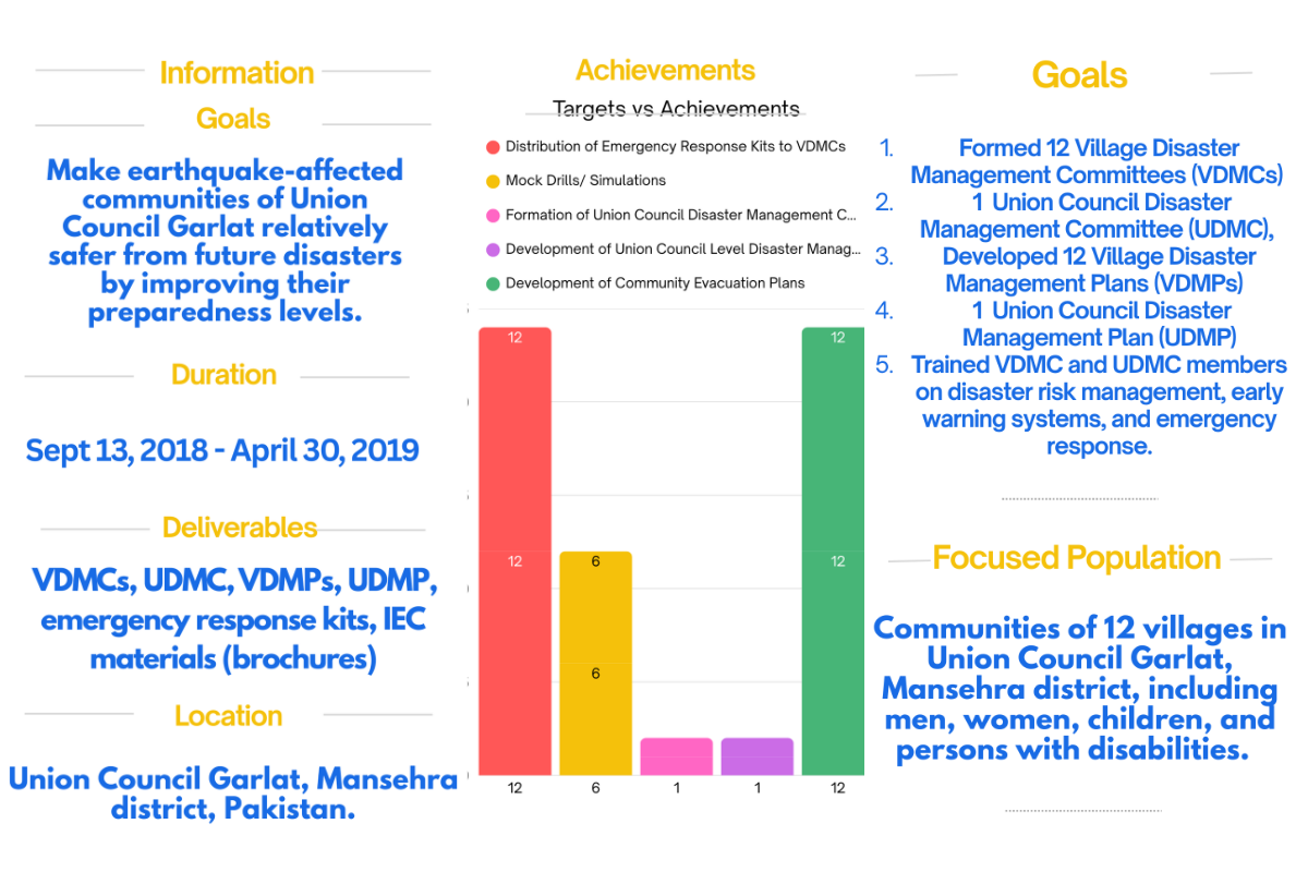 Over the past few decades or so, Tehsil Balakot of District Mansehra (KPK) remained under constant hit of natural disasters like, floods, landslides, palatal movement and earthquake. This adversely affected the communities and brought huge loss of lives in human and livestock besides damaging croplands and infrastructure. Unfortunately, there existed no proper structure to handle these natural disasters. The situations were handled in a haphazard unorganized manner without any coordination mechanism. This further worsened the situation and affected population went through miserable conditions. UC Garlat of Tehsil Balakot is highly vulnerable to natural disasters. A high proportion of the tehsil level is lost every year in landslides, floods, and many other forms of disasters. A high number of human casualties and loss of public and private property in UC Garlat is due to natural disasters may be attributed to inadequate public awareness, lack of disaster preparedness, weak governance, lack of coordination among the concerned government agencies, inadequate financial resources, and inadequate technical knowledge for mitigating the natural disasters, The communities of Subject UC did not had skills and expertise in the field of disaster management. Baseline study also reflected that target communities of 12 villages of UC Garlat including men, women, children and person with disability do not have any knowledge and skills to undertake or cope with any emergency situation. Based on the pre- project assessment conducted in the area and findings of baseline survey GEESE started its interventions under CBDRR project in 12 target villages of UC Garlat of Tehsil Balakot. During the project implementation phases, (GEESE) organized communities of targeted villages into Village level Disaster Management Committees (VDMCs) as a first step. To ensure the proper involvement of villagers, GEESE conducted separate Broad Based Community Meetings with both men and women in the target villages. To keep the process transparent, field team had detailed introductory meetings in all settlements for explaining the whole process and project objectives. During this period project teams mobilized the communities to form 12 VDMCs in 12 target villages. These VDMCs were supposed to have representation of women up to 30% but due to cultural sensitivity the required percentage was not achieved in 02 of the villages. GEESE arranged 04 day training at the subject villages where VDMC members were sensitized about natural disaster management effectively. These trainings were excitedly participated by men and women VDMC members. Women participated actively in Search and Rescue, HVCRA with special interest in First Aid. At next stage, each VDMC nominated one of the proactive male members to represent the village at UC level Disaster Management Committee (UDMC). The UDMC member are responsible for coordinating with all stakeholders involved one way or other in disaster management. After receiving regular training in CBDRM, the members of each VDMC developed Village Disaster Management Plan (VDMP) for their respective village. These VDMPs included all required information about past disasters, possible risks, resources required for managing risks, mitigation measures to be taken and information about different actors in DRM. During reporting period, the VDMCs developed 12VDMPs for their villages. UDMC was also engaged in development of Union Council Di saster Management Plan (UDMP). Keeping in view the important role of Local bodies representatives, GEESE conducted2-day long trainings for 39 members in two batches. After training members of local body realized the importance of DRR interventions and recommended different mitigation measures to be under taken at target villages under the budget provided in their annual development plan. Due to the GEESE CBDRR interventions, preparedness level of the communities of 12 target villages was enhanced and was reflected in the endline study