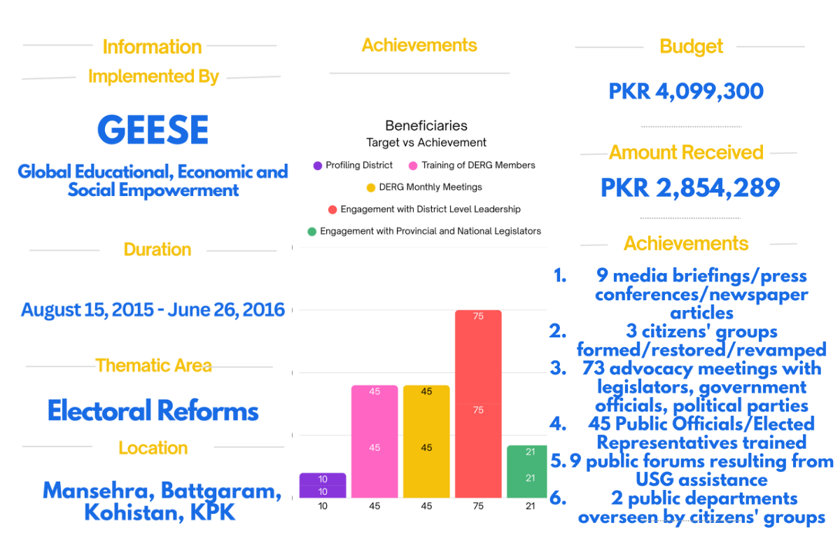 A nationwide campaign on the need for wide-ranging electoral reforms is critical to support advocacy that is currently being undertaken by national and international organizations interested in improving the electoral system in Pakistan. In this regard, public engagements with relevant stakeholders at the local level will help magnify citizens’ voices and also remind political parties of the public demand for electoral reforms. Objectives The objectives of this project are; Objective 1: To strengthen citizens’ voice through, among others, focused engagements with political parties, media, professional associations and election management body for electoral reforms, as recommended by national and international election observation groups after the General Election 2013. Objective 2: To strengthen citizen oversight of the electoral processes including but not limited to up-gradation of electoral rolls, delimitation of electoral constituencies for greater transparency and accountability. The project consists of four main components; all four will be implemented by the grantee organizations. These components are: 1) Mobilization of Project Resources, 2) Identification and Training of Activists and Youth Volunteers 3) Assessment and Data Collection 4) Advocacy on Identified Issues.